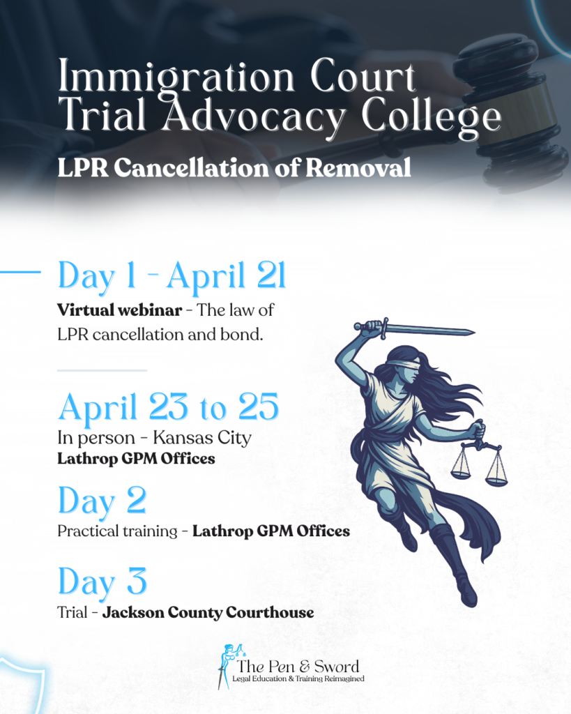 The Immigration Court Trial Advocacy College® program for 2026 has been reworked for maximum impact. The fight now requires a solid understanding of the law, an ability to quickly and succinctly put a case on, and controlling the message on every platform. It requires the ability to connect with the client on a different level and shift the perspective of the story to fit the audience so that they are engaged, empathetic, and eager to intervene for a just result.